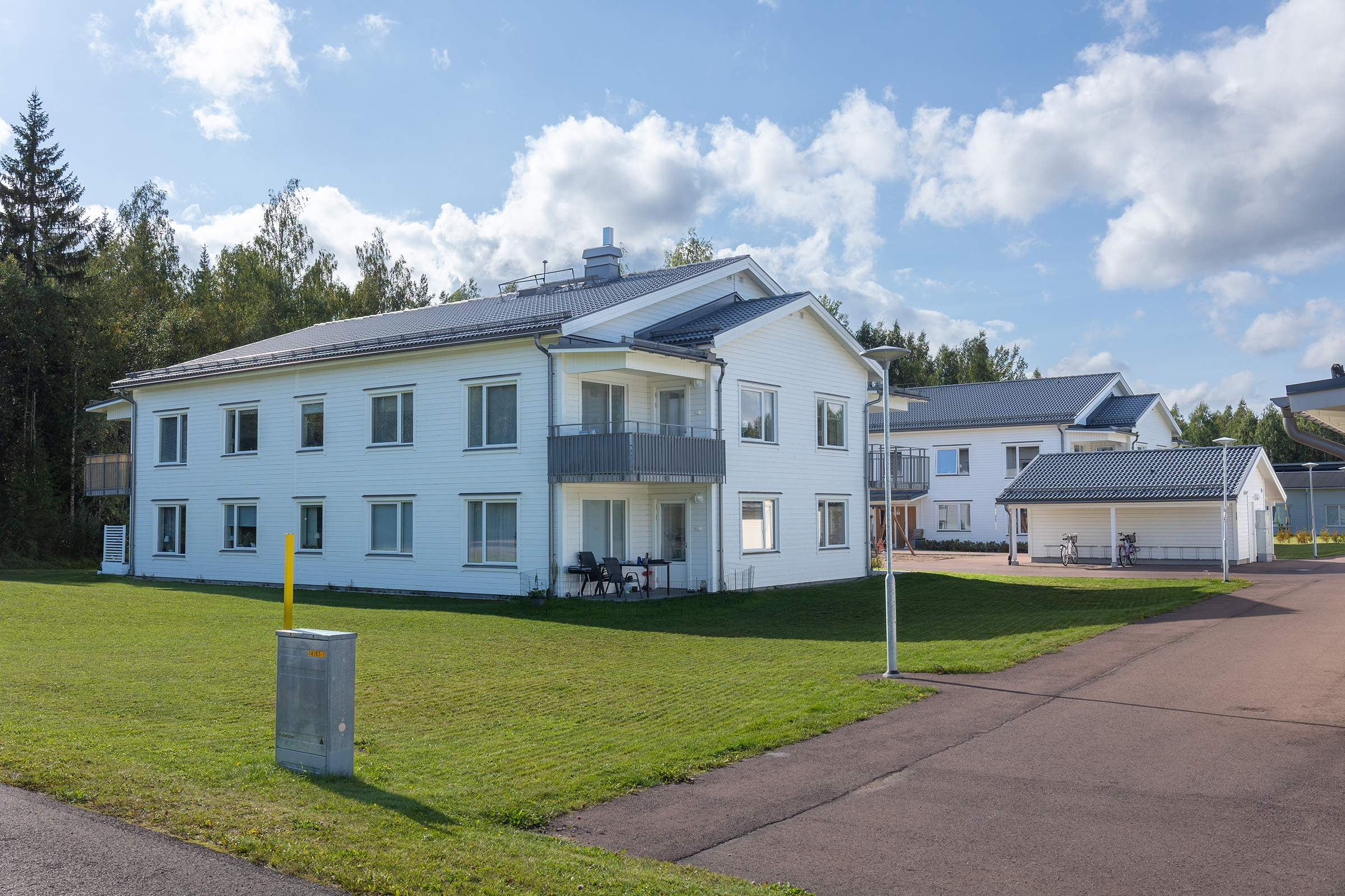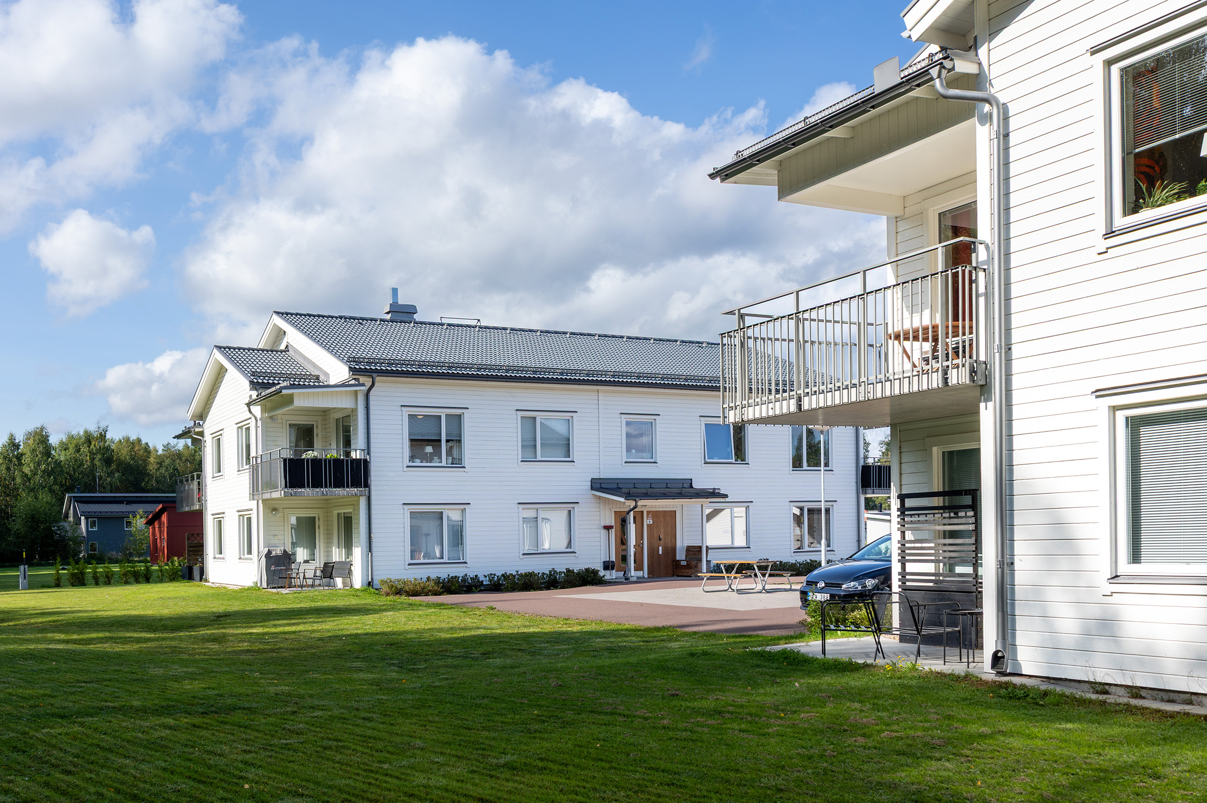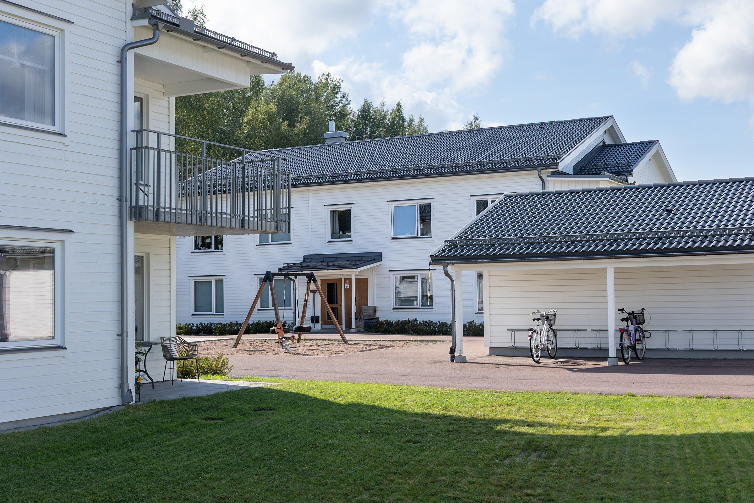 Området består av moderna tvåvåningshus med hiss, byggda med hög standard. Totalt finns 16 lägenheter, fördelade på två hus med åtta lägenheter i varje. Lägenheterna finns som tvåor och treor, alla med balkong eller uteplats. Boendet är katt- och rökfritt. Alla lägenehter är anslutna via fiber till Mora stadsnät, vilket möjliggör bredband, TV och telefoni.